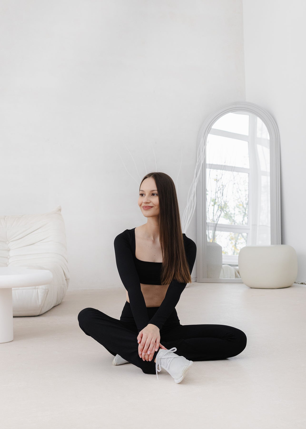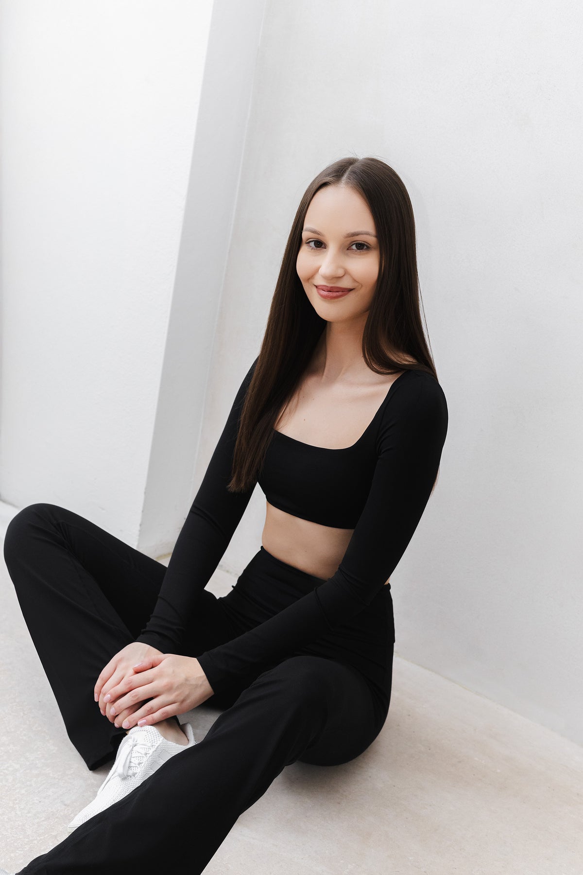 Top do jogi FLASH w czarnym kolorze to połączenie miejskiego stylu i sportowej energii. Krótki, dopasowany fason oraz długie rękawy podkreślają linię ciała i optycznie wysmuklają sylwetkę. Kwadratowy dekolt z wyjmowanymi miseczkami daje możliwość dopasowania poziomu wsparcia biustu do własnych preferencji. Odkryta talia i brzuch budują wyrazisty, kobiecy look pełen pewności siebie.
