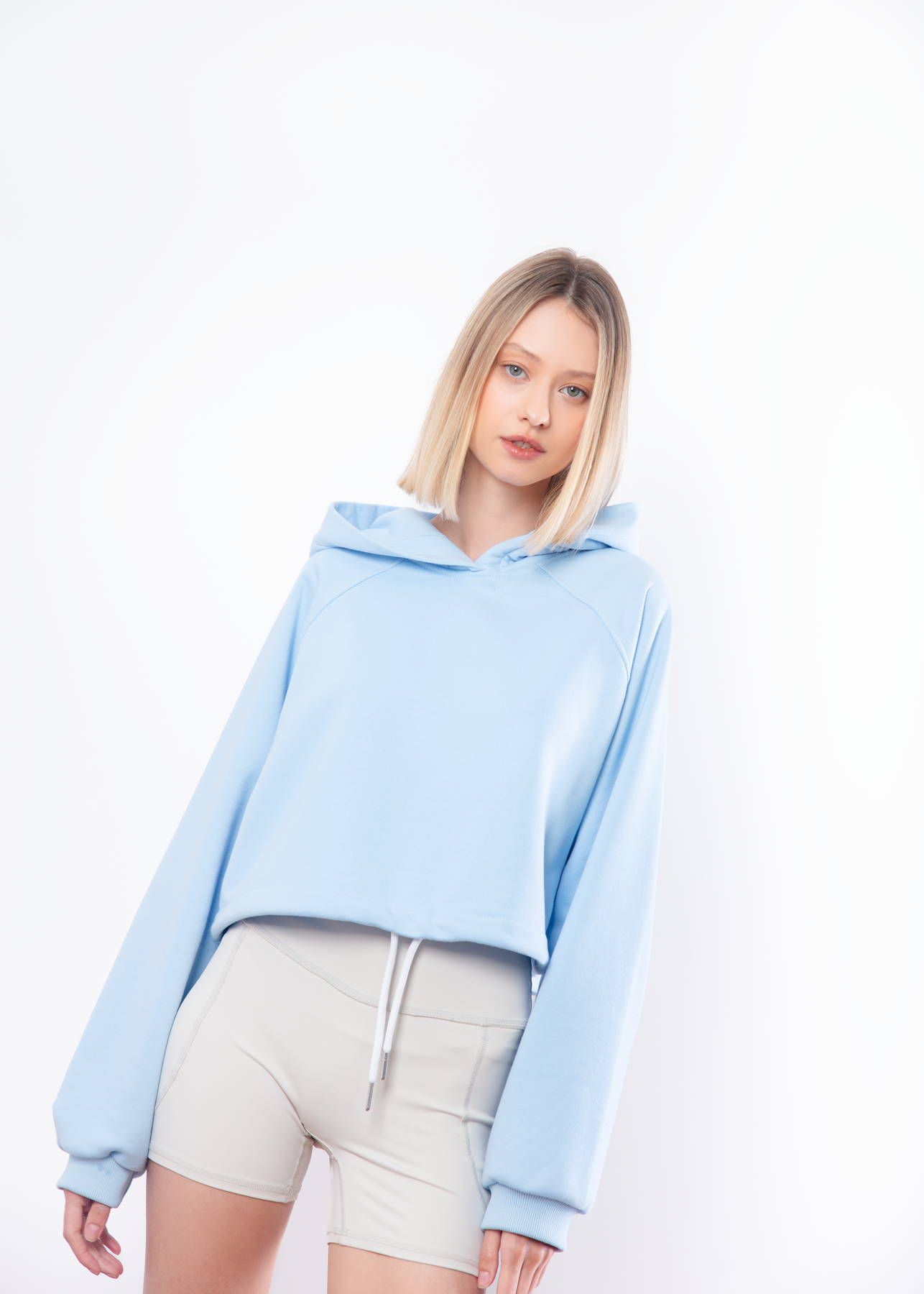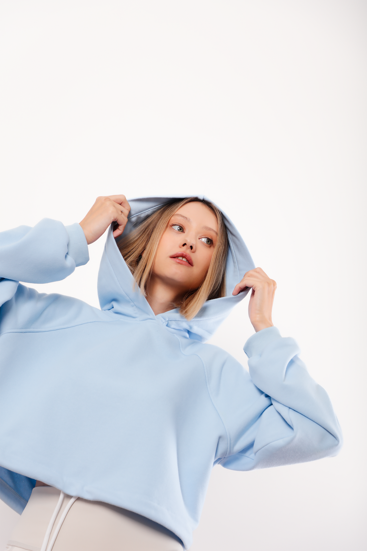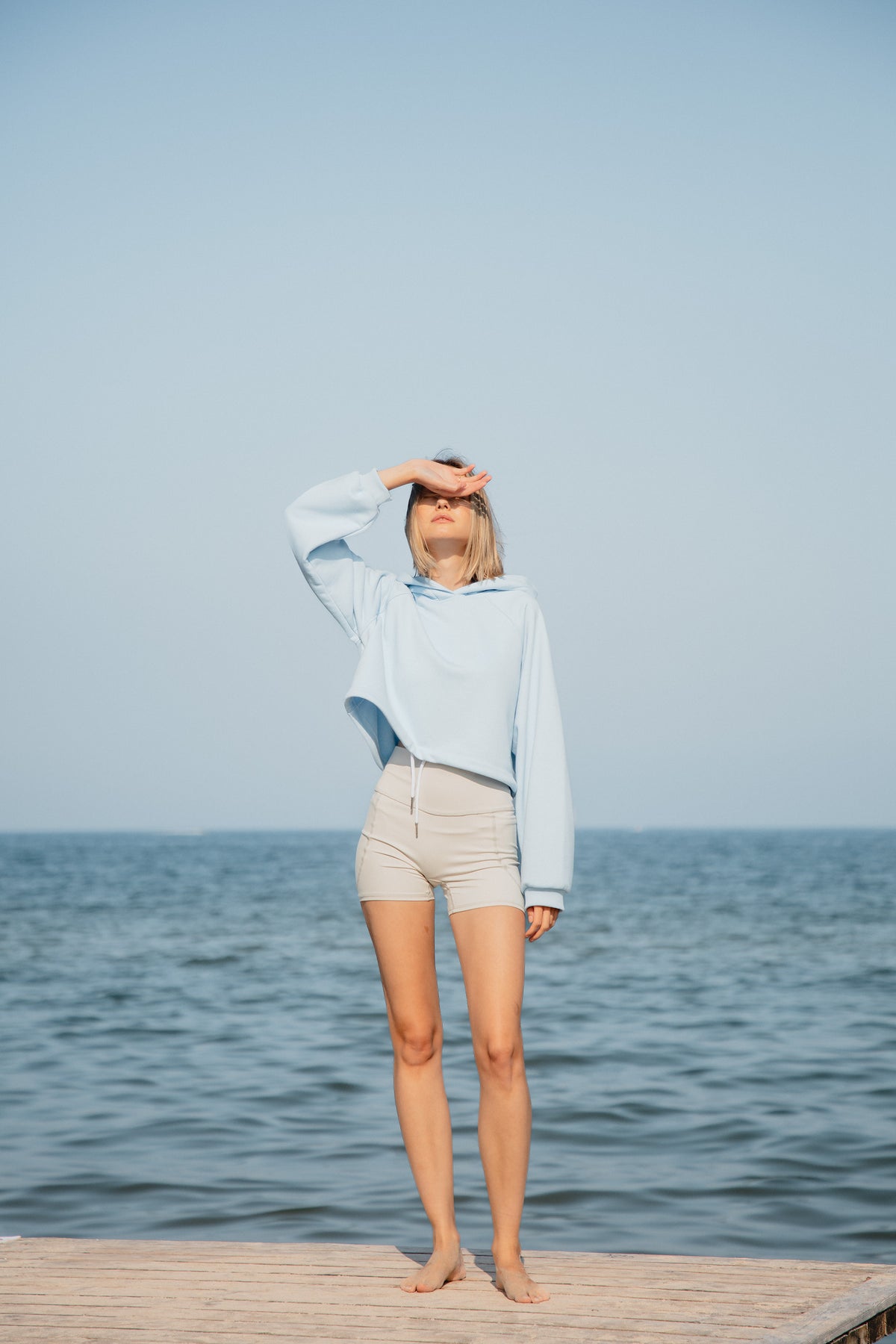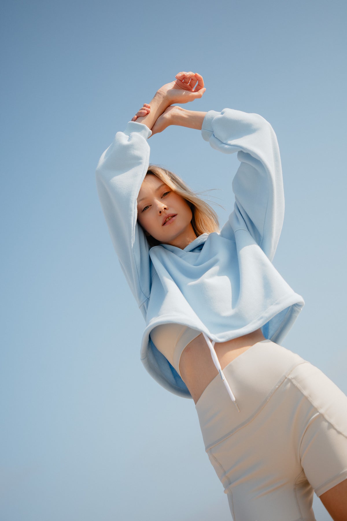 Ivy Hoodie od Moonholi to błękitna, lekka i luźna bluza z kapturem, zaprojektowana z myślą o jodze, pilatesie i aktywności na co dzień. Jej skrócony krój delikatnie dopasowuje się do sylwetki, oferując naturalną swobodę ruchów — zarówno podczas ćwiczeń, jak i w rytmie miejskiego życia. Luźna forma, kaptur i rękawy wykończone ściągaczami dodają stylowego luzu, a miękka, przyjemna w dotyku bawełna sprawia, że chce się ją nosić od rana do wieczora.