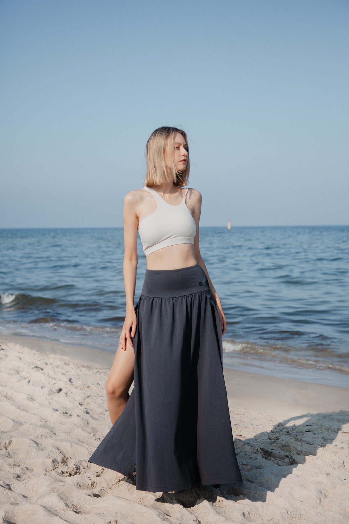 - Zwiewny, falowany krój maxi z bocznymi rozporkami zapewnia swobodę ruchu podczas jogi, pilatesu, fitnessu i codziennych aktywności