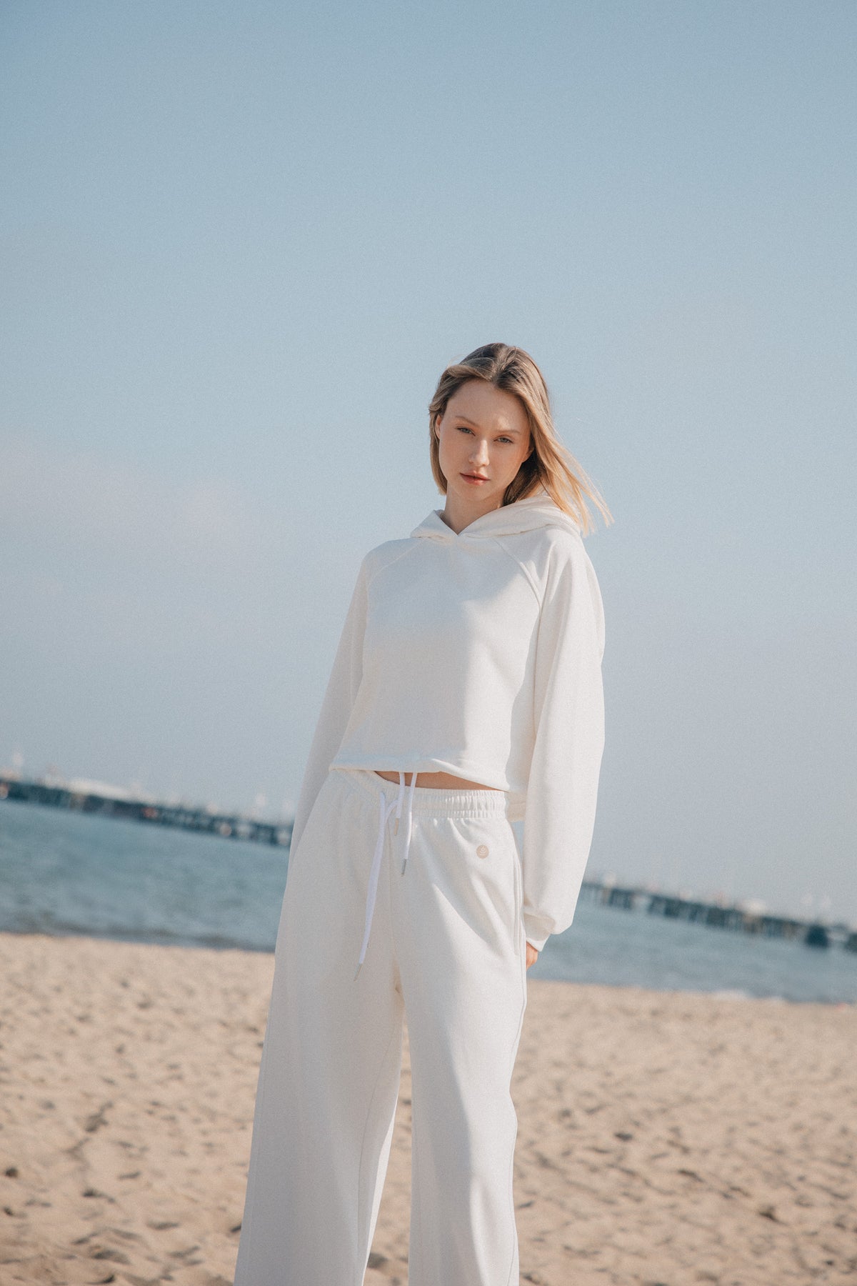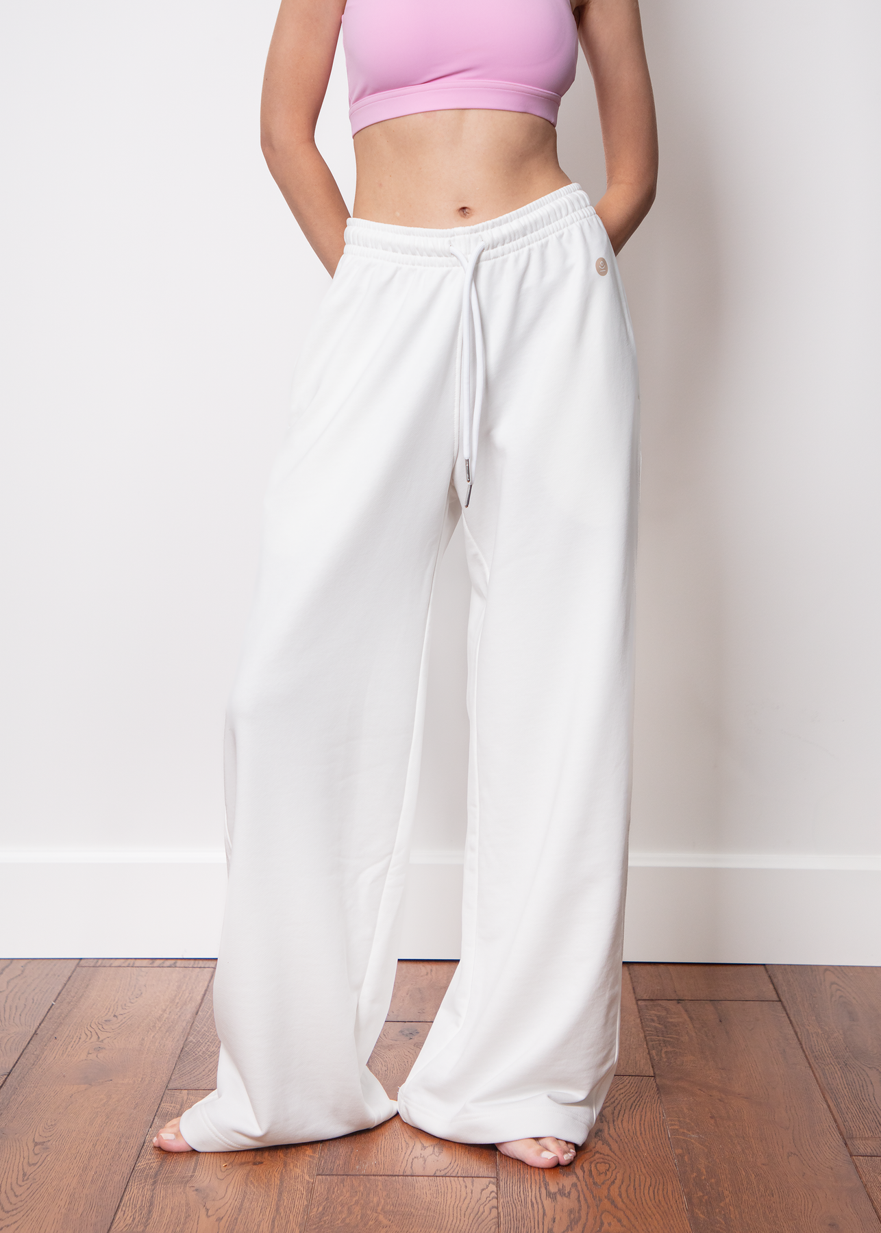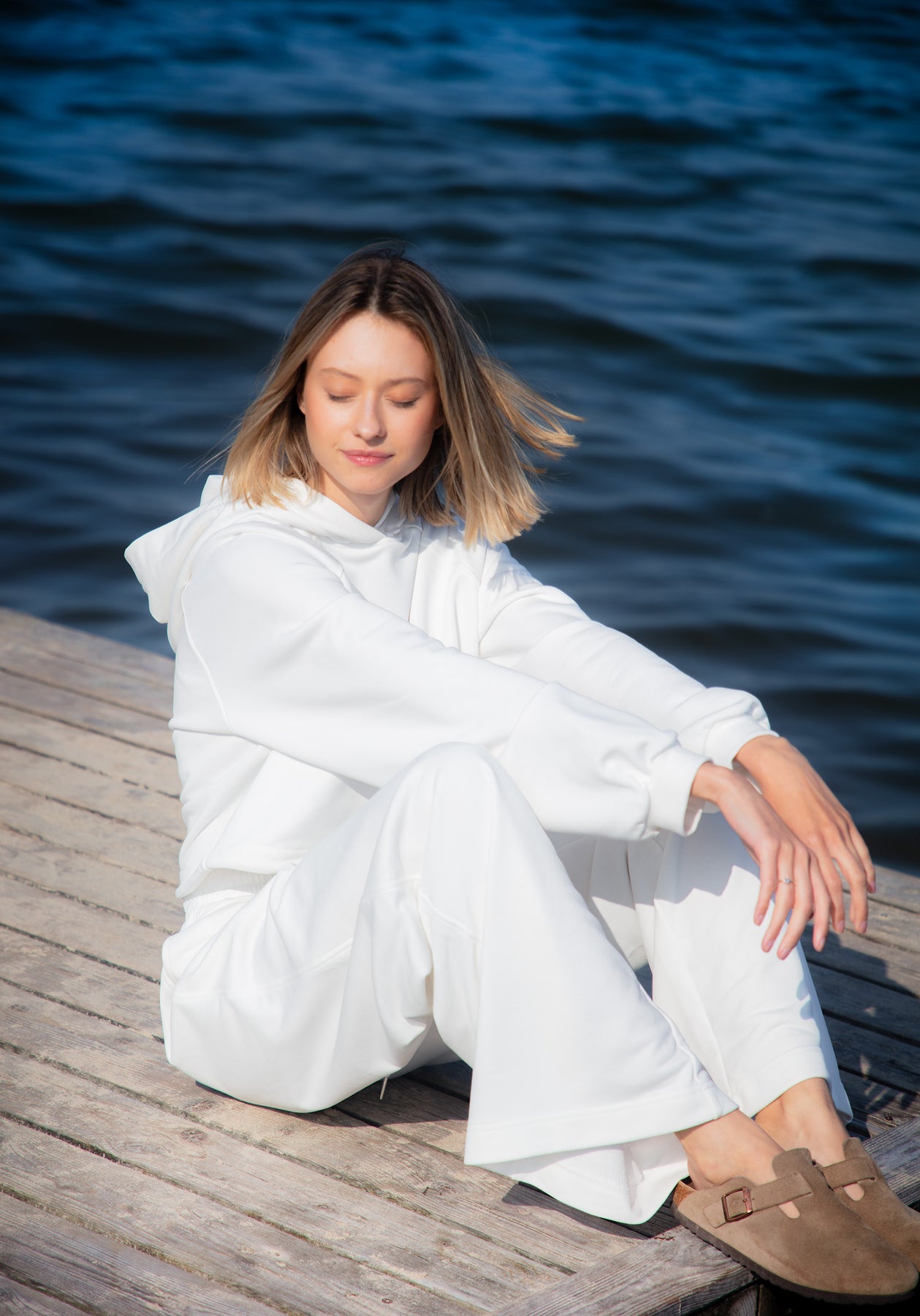 Białe spodnie do jogi Ivy Sweatpants otulają komfortem i swobodą łącząc jogowy vibe z codzienną wygodą. Luźny fason boot cut idealnie wpisujący się w obecne trendy nadaje sylwetce lekkości. Szerokie nogawki pięknie podkreślają ruch, sprawdzając się zarówno na macie jak i poza nią. Elastyczny ściągacz w pasie dopasowuje się do ciała, zapewniając wygodę w każdym skłonie, przysiadzie czy płynnej sekwencji. Przyjemny w dotyku materiał sprawia, że spodnie stają się naturalnym wyborem - do jogi, medytacji i spokojnych chwil w domu. Połącz spodnie dresowe Ivy Sweatpants z bluzą Ivy Hoodie i stwórz minimalistyczny set emanujący kobiecą harmonią.