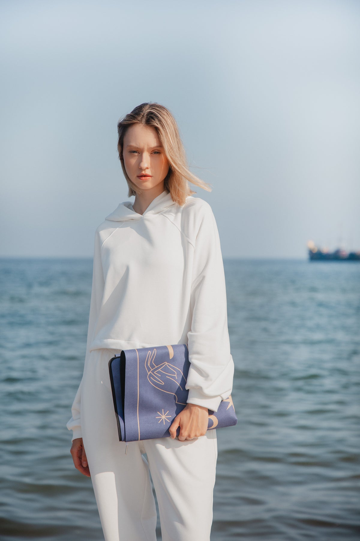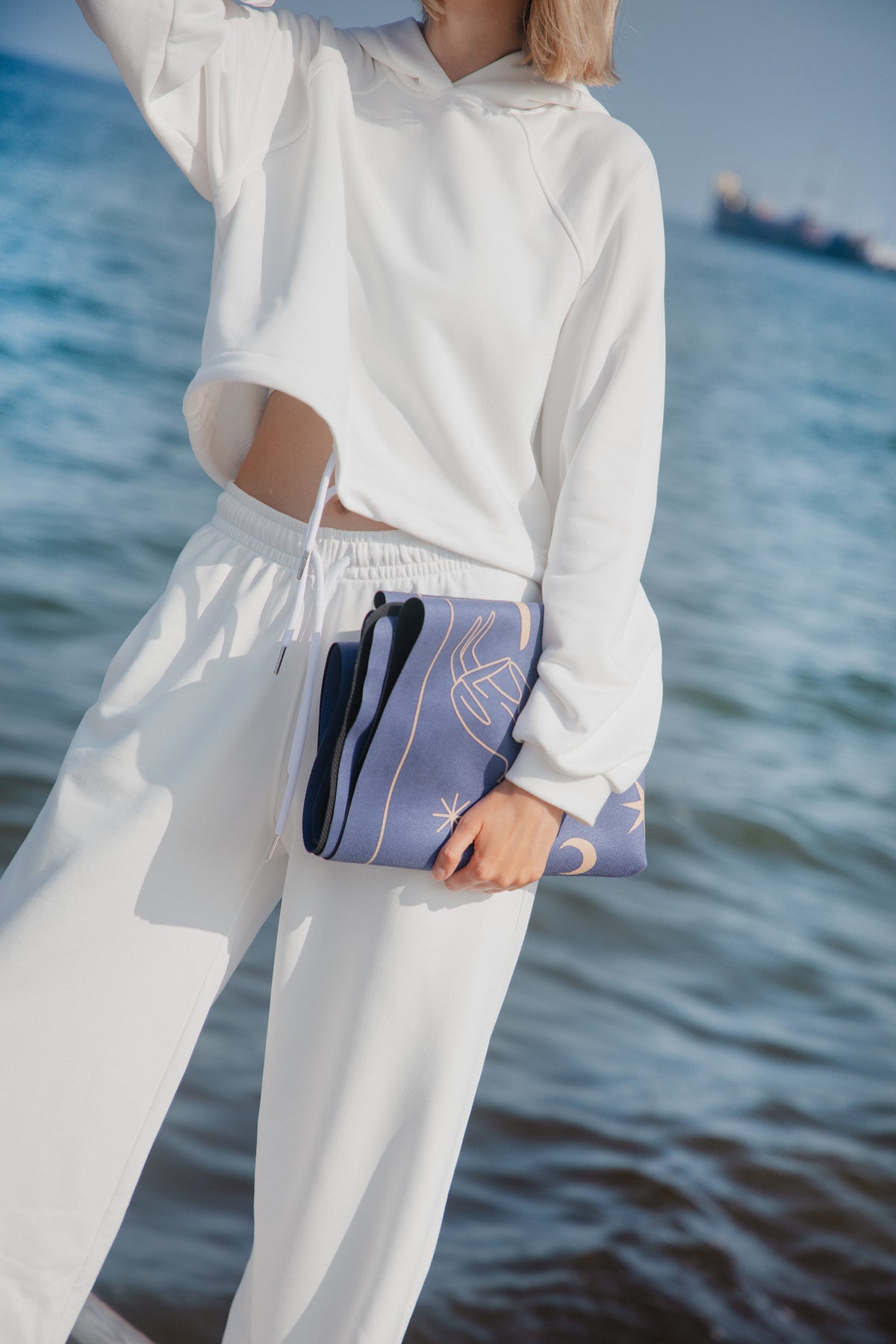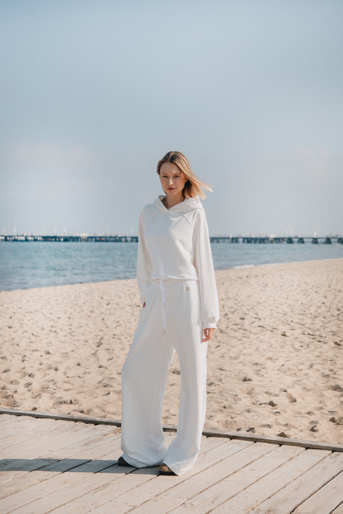 Białe spodnie do jogi Ivy Sweatpants otulają komfortem i swobodą łącząc jogowy vibe z codzienną wygodą. Luźny fason boot cut idealnie wpisujący się w obecne trendy nadaje sylwetce lekkości. Szerokie nogawki pięknie podkreślają ruch, sprawdzając się zarówno na macie jak i poza nią. Elastyczny ściągacz w pasie dopasowuje się do ciała, zapewniając wygodę w każdym skłonie, przysiadzie czy płynnej sekwencji. Przyjemny w dotyku materiał sprawia, że spodnie stają się naturalnym wyborem - do jogi, medytacji i spokojnych chwil w domu. Połącz spodnie dresowe Ivy Sweatpants z bluzą Ivy Hoodie i stwórz minimalistyczny set emanujący kobiecą harmonią.