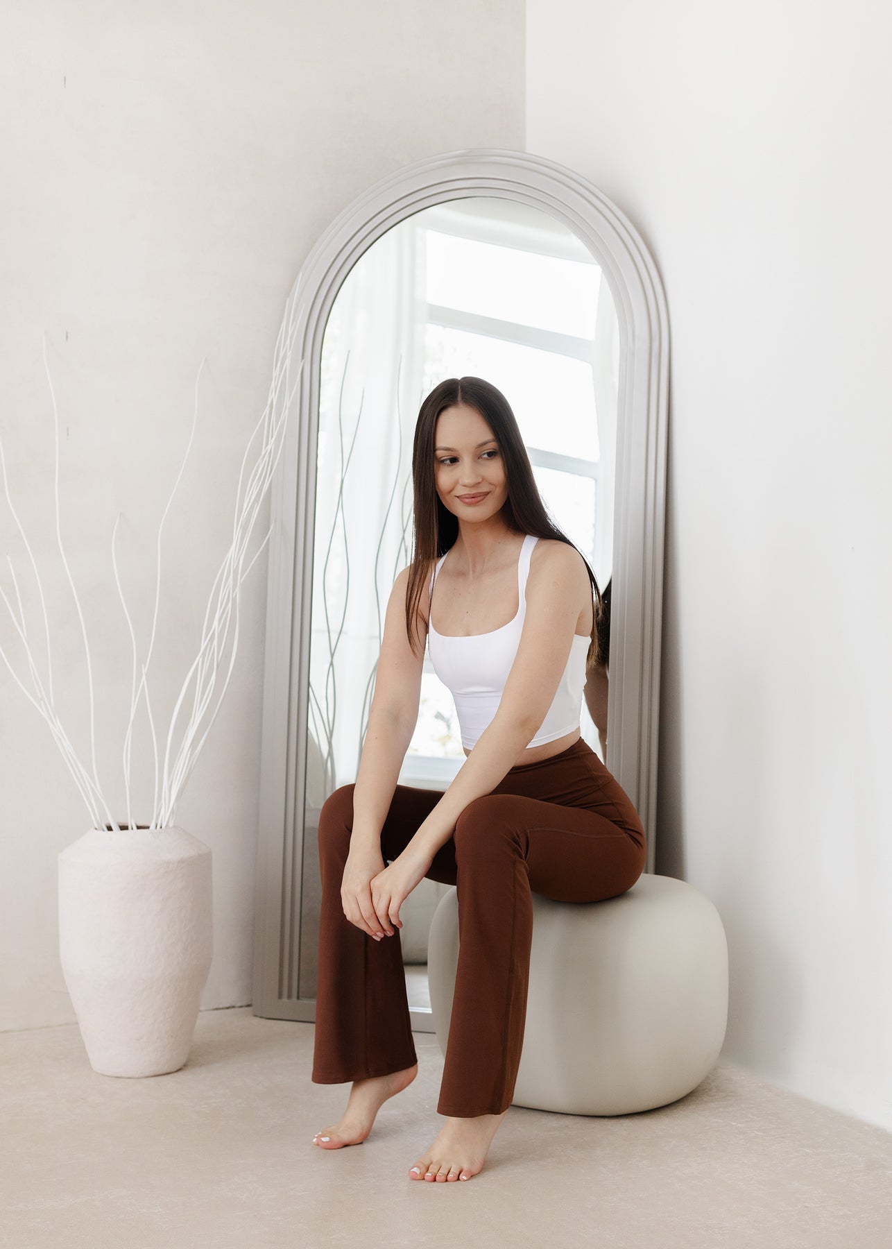 Legginsy do jogi FLARE w kolorze czekoladowym to harmonijne połączenie klasycznej formy i nowoczesnej funkcjonalności, stworzone z myślą o jodze i pilatesie. Wysoki stan komfortowo dopasowuje się do talii, a przylegająca góra płynnie przechodzi w rozszerzane nogawki, które naturalnie podążają za ruchem i nie ograniczają swobody podczas praktyki. Lekki, dzwonowaty krój dodaje sylwetce lekkości i sprawia, że spodnie świetnie odnajdują się zarówno w sportowych stylizacjach, jak i w codziennych, miejskich zestawach – od sneakersów po klasyczne loafersy. Miękki, elastyczny pas zapewnia stabilność, a delikatnie marszczony szew z tyłu subtelnie akcentuje pośladki, nadając sylwetce proporcjonalny, naturalny kształt.