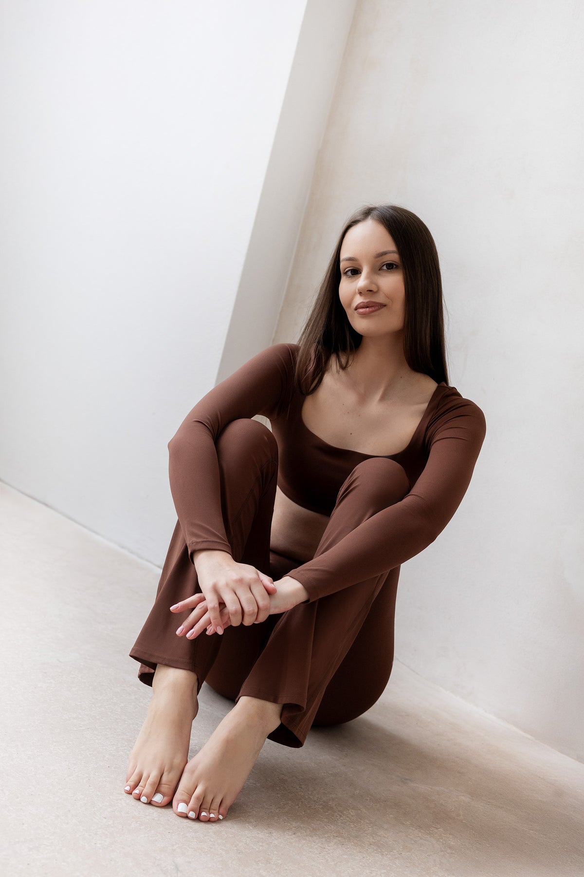 Top do jogi w odcieniu czekoladowym FLASH - miejski crop top z nutą sportowego pazura. Dopasowany krój i długie rękawy wysmuklają sylwetkę. Kwadratowy dekolt z wyciąganymi miseczkami pozwala kontrolować wsparcie biustu wedle potrzeby. Odsłonięta talia i brzuch tworzą efektowny, kobiecy i pewny siebie look.