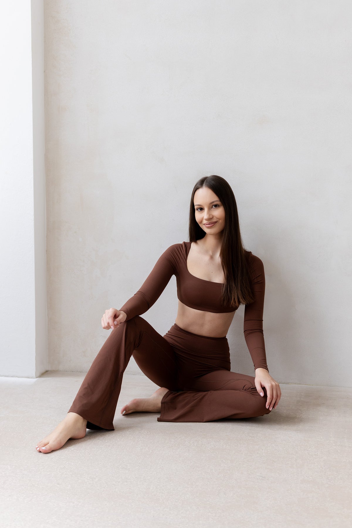 Połącz top ze spodniami FLARE w tym samym odcieniu - wyeksponuj proporcje ciała modelując sylwetkę spójnym zestawem sportowym do jogi.